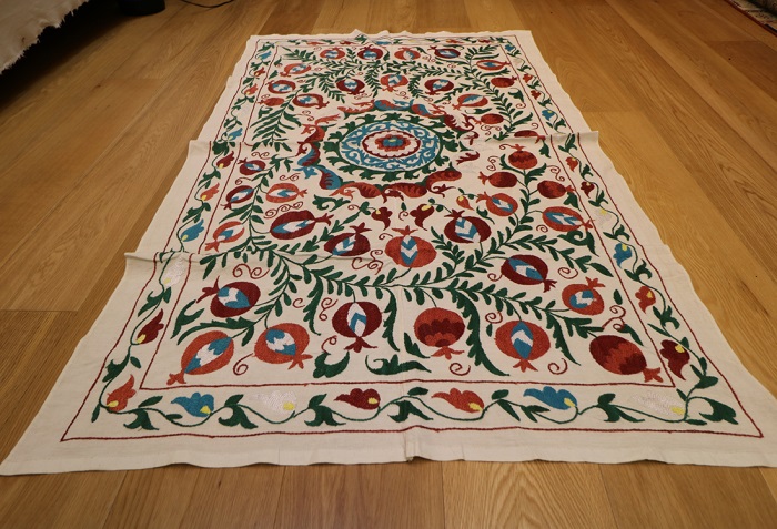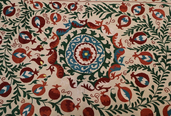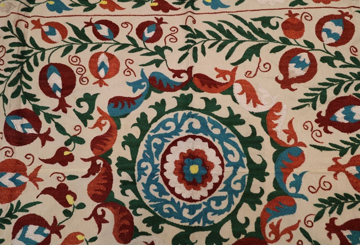 We are happy to bring you the latest and modern Uzbek suzanis at competitive prices. Our suzanis are genuine folk art, stitched by hand in the ancient traditional motif. You can use them as a cover for the bed and they can bring colour and texture to any environment. Suzani make delightful wall hangings, bedspreads, furniture throws, pillows, and even tablecloths.