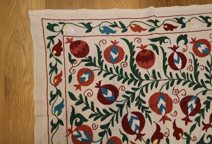Handmade Silk Suzani Embroidery - Suzani Embroidery Suzani means needlework - specifically, the exquisite silk yarn embroidery panels made by Uzbek masters. Traditionally this embroidery work should begin a mother once a daughter is born, and is continuing with the help of family and friends until the bride's dowry was complete.