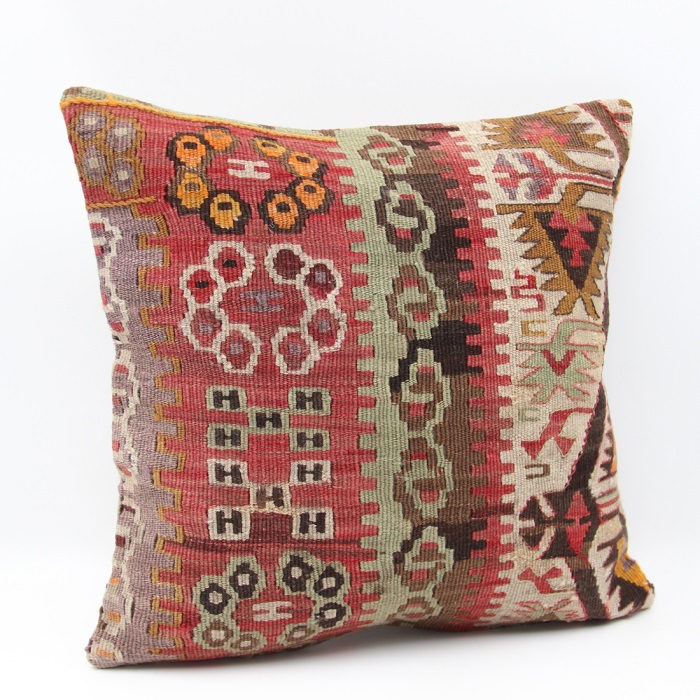 Kilims used in our products are old and genuine. These Kilim Cushions are made with pieces of carpets and kilims joined to make Kilim Cushion Covers. Kilim Pillows can be made for order for any size. Back has cotton with a zipper.