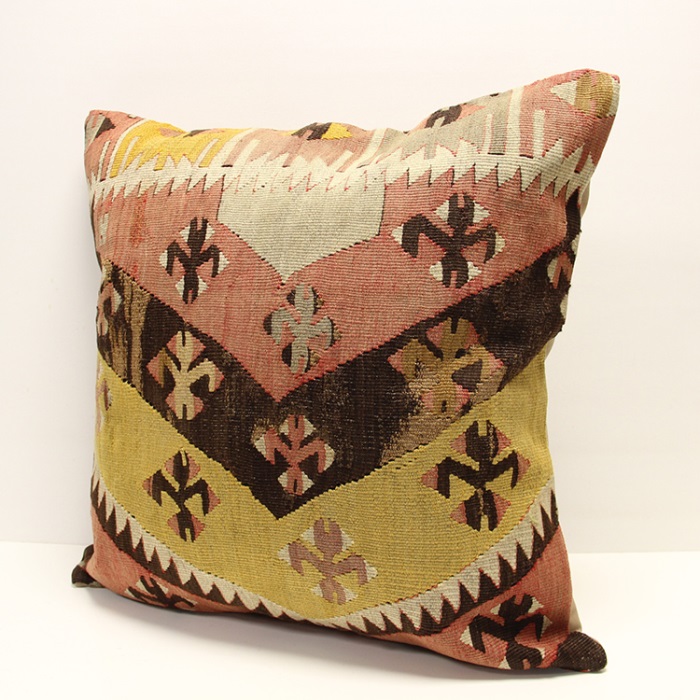 Kilims used in our products are old and genuine. These Kilim Cushions are made with pieces of carpets and kilims joined to make Kilim Pillow Covers. Kilim Cushion Covers can be made for order for any size. Back has cotton with a zipper.