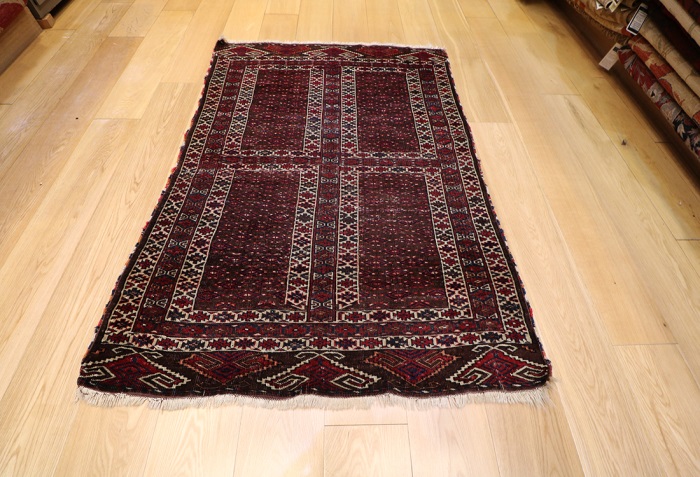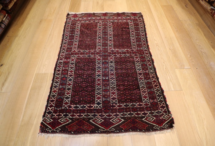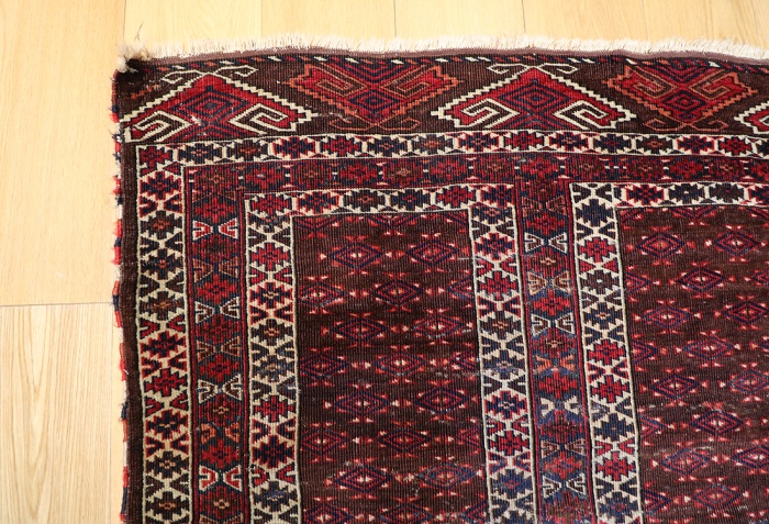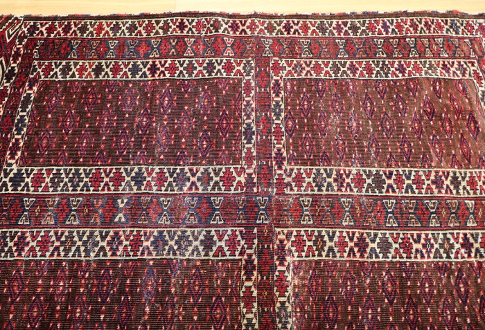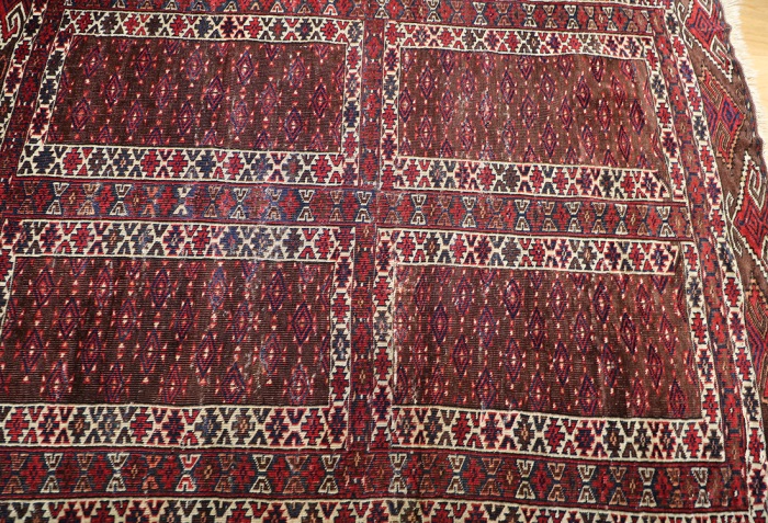 This rug is over a hundred years old. It is in generally good condition with little wear and some minor damage