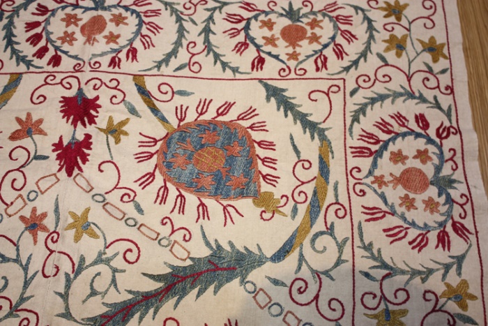 Absolutely Beautiful Silk Suzani Embroidery usually have cotton and silk (sometimes pure silk) fabric base, which is embroidered in silk or cotton thread. Chain, satin, and buttonhole stitches are the primary stitches used. There is also extensive use of couching, in which decorative thread laid on the fabric as a raised line is stitched in place with a second thread. Suzanis are often made in two or more pieces that are then stitched together. Patterns usually white or black, and they are meant to be look older, so Suzanis sometimes look older even thou they are just made.
